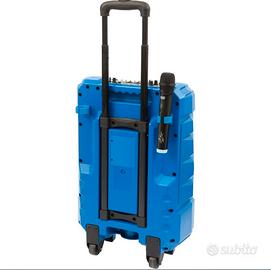 Dotato di RUOTE e MANICO TELESCOPICO per un facile trasporto. BATTERIA RICARICABILE che permette un utilizzo continuato fino a 4h. Include MICROFONO WIRELESS con portata fino a 10m, con VOLUME ed EFFETTO ECO, dotata di 2 FREQUENZE RADIO per cantare contemporaneamente