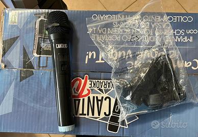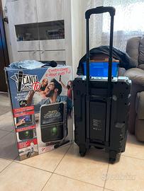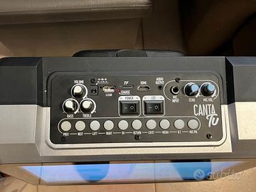 Vendo sistema karaoke Canta Tu professionale e portatile. L'oggetto è esteticamente e funzionalmente pari al nuovo, utilizzato soltanto poche volte e poi riposto con cura. Schermo touch enorme (14 pollici), sistema Android (usi YouTube direttamente dal dispositivo), Wi-Fi, Bluetooth e cassa potentissima da 40W. Microfono wireless originale incluso e scatola originale integra. Trasporto comodissimo grazie alle ruote e alla maniglia a trolley.