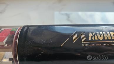 Condensatore Mundorf 1 farad, Ottimo per impianti audio Hi hend, ha qualche ammaccatura sui lati ed il coperchio superiore ammaccato, nulla che pregiudichi la funzionalità.