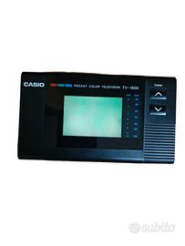 Televisore tascabile a colori LCD TV-1500 Casio del 1988 - funziona con 4 batterie AA. Presenta una antenna metallica estraibile. Si accende e si illumina di verde. Non esistendo più la televisione analogica non è in grado di trovare canali, ma è un valido oggetto da collezionismo.
