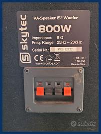 Vendo diffusore Skytec 800W, modello “Unità di Potenza X”, perfettamente funzionante. Ideale per DJ set, eventi, piccole installazioni o uso domestico avanzato. Caratteristiche principali: Potenza nominale: 800W, adatta a spazi medi e grandi Qualità audio bilanciata tra alti, medi e bassi Connessioni XLR, jack e RCA compatibili Cabinet robusto, trasportabile e montabile su supporto Condizioni: Usato, testato e funzionante al 100% Piccoli segni estetici coerenti con uso normale no a proposte di sconto