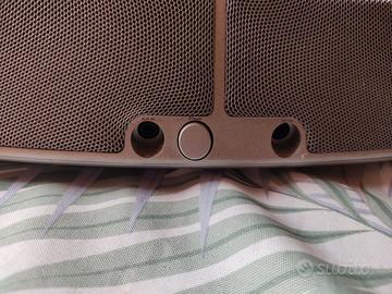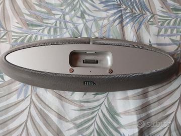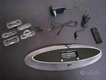 Speaker dock( cassa acustica) per ipod e iPhone 4 e seguenti ,dotato di adattatore, telecomando a raggi infrarossi, cavo audio con mini jack( funziona come cassa acustica, consentendo di collegare qualsiasi lettore MP3 ,CD e computer),alimentatore, scatola originale e istruzioni d' uso. Grande qualità acustica