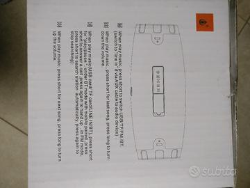 cassa acustica portatile a batteria condizioni pari al nuovo completa di tracolla connessione Bluetooth connessione via cavo Jack cuffie lettore Mini card e ingresso USB. utilizzata pochissimo circa 4 ore in tutto. completa di imballo originale e istruzioni. non fate proposte il prezzo non è trattabile ma è comprensivo di spedizione.
