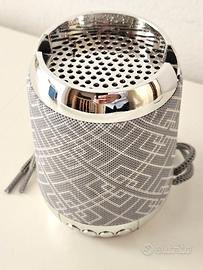 Cassa altoparlante wireless dal design moderno e compatto, perfetta da portare ovunque. Ideale per aumentare il suono di cellulari, pc, tablet. Portable wireless speaker fino a 10 metri di distanza. -Finitura in tessuto a trama geometrica -Dettagli metallici lucidi -Pulsanti di controllo sul fondo -Potenza audio 5W -Altezza 10 cm