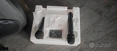 CONFEZIONE: Il set comprende 1 altoparlante, cavo di ricarica, 1 custodia per gli accessori: 1 telecomando, 1 microfono portatile senza fili VHF (207,5 MHz), 1 microfono portatile con cavo. Portata del microfono di 50-60 m all'aperto e di 25-30 m in ambienti chiusi, in piena vista.