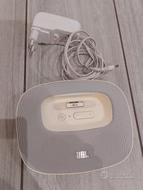 Cassa audio della JBL, modello "onbeat micro speaker dock for iphone and ipad", con ingressi audio e Usb; colore bianco.
