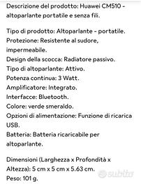 causa inutilizzo vendo questa mini-cassa bluetooth Huawei CM-510 nera, perfettamente funzionante, con cavo di ricarica USB , istruzioni, nella sua scatola originale, e ovviamente le istruzioni per il pairing al vostro dispositivo