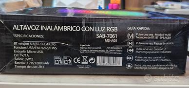 Descrizione Cassa Bluetooth portatile con funzione radio FM e USB. - 5 modalità di illuminazione brillanti. Design moderno e compatto.