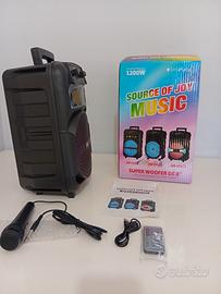 Speaker Cassa bluetooth , karaoke portatile 1200 watt pmpo, altoparlante da 8 pollici.Batteria incorporata ricaricabile, luci a tempo di musica, funzione bluetooth hu wireless, ingresso USB, radio FM, ingresso micro SD, ingresso aux. Nella scatola in dotazione: microfono con filo, cavetto USB per ricaricare e telecomando. Misure: altezza 38 cm, larghezza 25 cm profondità 20 cm. Altoparlante di ottima qualità . Rapporto qualità prezzo ottimo.