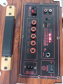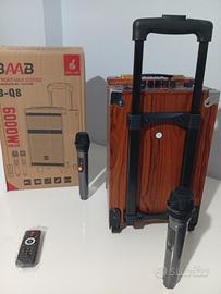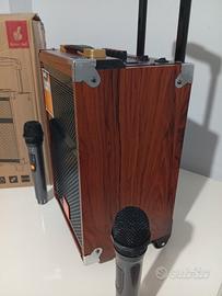 Cassa bluetooth portatile speaker karaoke trolley, 6000 Watt pmpo di picco , altoparlante da 8 pollici . Cassa trolley, scocca interamente in legno, microfono wireless di alta qualità. Batteria da 3000 mha ricaricabile incorporata, può essere collegata anche direttamente alla corrente elettrica qualora si dovesse scaricare la batteria. Amplificatore incorporato. Prodotto di altissima qualità, sia a livello di rifiniture che di qualità di riproduzione della musica , karaoke trolley, 6000 Watt pmpo di picco💣 , altoparlante da 8 pollici . Frequenza 150-18khz. Funzione bluetooth wireless, ingresso USB, radio FM, ingresso micro SD, ingresso aux , ingresso DC 12V IN, ingresso L R, possono essere collegati mixer e cdj . Display digitale, manopole volume, manopole regolazione bassi e alti . Nella confezione in dotazione,N. 2 microfoni wireless senza fili , telecomando di qualità, cavo per ricaricare con spina standard europea. Prodotto di altissima qualità, bassi secchi e avvolgenti, per un sound fantastico. Interamente in legno, qualità della musica riprodotta eccezionale. Tecnologia di pressurizzazione dell altoparlante, compatto ma potente . Modalità TWS, possono essere collegati in modalità bluetooth 2 altoparlanti contemporaneamente e suonano la stessa musica, senza bisogno di collegare fili . Misure: altezza 42 cm , larghezza 25 cm profondità 25 cm, cassa compatta ma molto potente. Prodotto di alta qualità, sound eccezionale,qualità eccellente!!