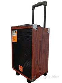 Speaker, Bellissima Cassa bluetooth portatile speaker karaoke trolley, 6000 Watt pmpo di picco , altoparlante da 8 pollici . Cassa trolley, scocca interamente in legno, microfono wireless di alta qualità. Batteria da 3000 mha ricaricabile incorporata, può essere collegata anche direttamente alla corrente elettrica qualora si dovesse scaricare la batteria. Amplificatore incorporato. Prodotto di altissima qualità, sia a livello di rifiniture che di qualità di riproduzione della musica , karaoke trolley, 6000 Watt pmpo di picco💣 , altoparlante da 8 pollici . Frequenza 150-18khz. Funzione bluetooth wireless, ingresso USB, radio FM, ingresso micro SD, ingresso aux , ingresso DC 12V IN, ingresso L R, possono essere collegati mixer e cdj . Display digitale, manopole volume, manopole regolazione bassi e alti . Nella confezione in dotazione,N. 2 microfoni wireless senza fili , telecomando di qualità, cavo per ricaricare con spina standard europea. Prodotto di altissima qualità, bassi secchi e avvolgenti, per un sound fantastico. Interamente in legno, qualità della musica riprodotta eccezionale. Tecnologia di pressurizzazione dell altoparlante, compatto ma potente . Modalità TWS, possono essere collegati in modalità bluetooth 2 altoparlanti contemporaneamente e suonano la stessa musica, senza bisogno di collegare fili . Misure: altezza 42 cm , larghezza 25 cm profondità 25 cm, cassa compatta ma molto potente. SUONO ECCELLENTE!.