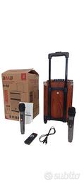 Bellissima Cassa bluetooth portatile speaker karaoke trolley, 6000 Watt pmpo di picco , altoparlante da 8 pollici . Cassa trolley, scocca interamente in legno, microfono wireless di alta qualità. Batteria da 3000 mha ricaricabile incorporata, può essere collegata anche direttamente alla corrente elettrica qualora si dovesse scaricare la batteria. Amplificatore incorporato. Prodotto di altissima qualità, sia a livello di rifiniture che di qualità di riproduzione della musica , karaoke trolley, 6000 Watt pmpo di picco💣 , altoparlante da 8 pollici . Frequenza 150-18khz. Funzione bluetooth wireless, ingresso USB, radio FM, ingresso micro SD, ingresso aux , ingresso DC 12V IN, ingresso L R, possono essere collegati mixer e cdj . Display digitale, manopole volume, manopole regolazione bassi e alti . Nella confezione in dotazione,N. 2 microfoni wireless senza fili , telecomando di qualità, cavo per ricaricare con spina standard europea. Prodotto di altissima qualità, bassi secchi e avvolgenti, per un sound fantastico. Interamente in legno, qualità della musica riprodotta eccezionale. Tecnologia di pressurizzazione dell altoparlante, compatto ma potente . Modalità TWS, possono essere collegati in modalità bluetooth 2 altoparlanti contemporaneamente e suonano la stessa musica, senza bisogno di collegare fili . Misure: altezza 42 cm , larghezza 25 cm profondità 25 cm, cassa compatta ma molto potente. Suono eccellente.