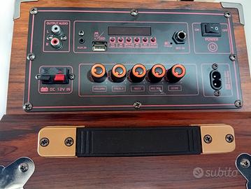 Bellissima Cassa bluetooth portatile speaker karaoke trolley, 6000 Watt pmpo di picco , altoparlante da 8 pollici . Cassa trolley, scocca interamente in legno, microfono wireless di alta qualità. Batteria da 3000 mha ricaricabile incorporata, può essere collegata anche direttamente alla corrente elettrica qualora si dovesse scaricare la batteria. Amplificatore incorporato. Prodotto di altissima qualità, sia a livello di rifiniture che di qualità di riproduzione della musica , karaoke trolley, 6000 Watt pmpo di picco💣 , altoparlante da 8 pollici . Frequenza 150-18khz. Funzione bluetooth wireless, ingresso USB, radio FM, ingresso micro SD, ingresso aux , ingresso DC 12V IN, ingresso L R, possono essere collegati mixer e cdj . Display digitale, manopole volume, manopole regolazione bassi e alti . Nella confezione in dotazione,N. 2 microfoni wireless senza fili , telecomando di qualità, cavo per ricaricare con spina standard europea. Prodotto di altissima qualità, bassi secchi e avvolgenti, per un sound fantastico. Interamente in legno, qualità della musica riprodotta eccezionale. Tecnologia di pressurizzazione dell altoparlante, compatto ma potente . Modalità TWS, possono essere collegati in modalità bluetooth 2 altoparlanti contemporaneamente e suonano la stessa musica, senza bisogno di collegare fili . Misure: altezza 42 cm , larghezza 25 cm profondità 25 cm, cassa compatta ma molto potente. Suono eccellente!!!