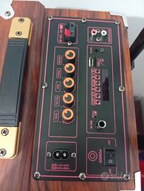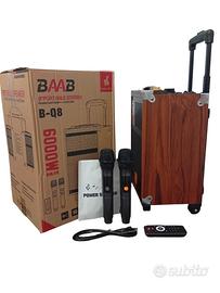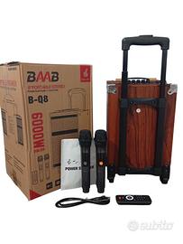 Bellissima Cassa bluetooth portatile speaker karaoke trolley, 6000 Watt pmpo di picco , altoparlante da 8 pollici . Cassa trolley, scocca interamente in legno, microfono wireless di alta qualità. Batteria da 3000 mha ricaricabile incorporata, può essere collegata anche direttamente alla corrente elettrica qualora si dovesse scaricare la batteria. Amplificatore incorporato. Prodotto di altissima qualità, sia a livello di rifiniture che di qualità di riproduzione della musica , karaoke trolley, 6000 Watt pmpo di picco💣 , altoparlante da 8 pollici . Frequenza 150-18khz. Funzione bluetooth wireless, ingresso USB, radio FM, ingresso micro SD, ingresso aux , ingresso DC 12V IN, ingresso L R, possono essere collegati mixer e cdj . Display digitale, manopole volume, manopole regolazione bassi e alti . Nella confezione in dotazione,N. 2 microfoni wireless senza fili , telecomando di qualità, cavo per ricaricare con spina standard europea. Prodotto di altissima qualità, bassi secchi e avvolgenti, per un sound fantastico. Interamente in legno, qualità della musica riprodotta eccezionale. Tecnologia di pressurizzazione dell altoparlante, compatto ma potente . Modalità TWS, possono essere collegati in modalità bluetooth 2 altoparlanti contemporaneamente e suonano la stessa musica, senza bisogno di collegare fili . Misure: altezza 42 cm , larghezza 25 cm profondità 25 cm, cassa compatta ma molto potente. SUONO ECCELLENTE, qualità sonora eccellente..