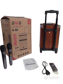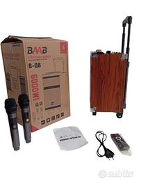 Bellissima Cassa bluetooth portatile karaoke speaker trolley, 6000 Watt pmpo di picco , altoparlante da 8 pollici . Cassa trolley, scocca interamente in legno, microfono wireless di alta qualità. Batteria da 3000 mha ricaricabile incorporata, può essere collegata anche direttamente alla corrente elettrica qualora si dovesse scaricare la batteria. Amplificatore incorporato. Prodotto di altissima qualità, sia a livello di rifiniture che di qualità di riproduzione della musica , karaoke trolley, 6000 Watt pmpo di picco💣 , altoparlante da 8 pollici . Frequenza 150-18khz. Funzione bluetooth wireless, ingresso USB, radio FM, ingresso micro SD, ingresso aux , ingresso DC 12V IN, ingresso L R, possono essere collegati mixer e cdj . Display digitale, manopole volume, manopole regolazione bassi e alti . Nella confezione in dotazione,N. 2 microfoni wireless senza fili , telecomando di qualità, cavo per ricaricare con spina standard europea. Prodotto di altissima qualità, bassi secchi e avvolgenti, per un sound fantastico. Interamente in legno, qualità della musica riprodotta eccezionale. Tecnologia di pressurizzazione dell altoparlante, compatto ma potente . Modalità TWS, possono essere collegati in modalità bluetooth 2 altoparlanti contemporaneamente e suonano la stessa musica, senza bisogno di collegare fili . Misure: altezza 42 cm , larghezza 25 cm profondità 25 cm, cassa compatta ma molto potente. SUONO ECCELLENTE, qualità sonora eccellente.
