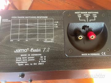 Cassa centrale Jamo serie 7.2. Massima potenza in ingresso 80watt, range di frequenza 70 - 20000 Hz, sensibilità 90 db, impedenza 6 Ohm. Dimensioni 564X208X167 peso 6 kg. Cassa molto performante per un impianto di alto livello.