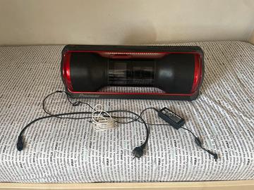 Cassa portatile Pioneer STZ-D10Z-R. •Potenza: 2x10W + 1x20W subwoofer •Connessioni: , USB, AUX, dock iPod/iPhone •Memoria interna: 4 GB •Display LCD 3,5” •Alimentazione: corrente o 10 batterie tipo D •Funzioni: DJ Mix, tempo control, auto battle mode •Telecomando incluso Buone condizioni, perfettamente funzionante.