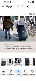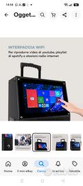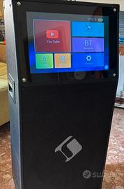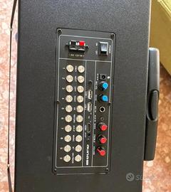 La cassa è dotata di una batteria 4,5 a/12 V integrata con indicatore di carica completamente indipendente dalla rete elettrica e può funzionare fino a 5 ore. Nel prezzo sono inclusi anche 2 microfoni wireless VHF per il karaoke e un telecomando. Solo consegna a mano perché è troppo grande.