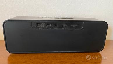 Cassa portatile Muzili di colore nero. Questo dispositivo è un altoparlante Bluetooth portatile Muzili. • Connettività: Supporta Bluetooth 5.0 e dispone di un ingresso AUX jack da 3,5 mm. • Audio: Dotato di due driver da 3W (stereo) per un totale di 6W di potenza. • • Batteria: Batteria ricaricabile da 1800mAh che offre fino a 10 ore di riproduzione. • • Funzionalità aggiuntive: Include uno slot per schede di memoria per riprodurre playlist MP3. (