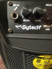 cassa portatile marca sytech, con retroilluminazione stile disco , doppio altoparlante per bassi e doppio tweeter , con radio stereo, usb, lettore schede memoria, bluetooth, aux, possibilita di utilizzare il microfono con relative regolazioni (il microfono non lo ho piu' , ma potrete reperirlo per 3 euro perfino dai cinesi) e' completa di scatolo originale, cavo alimentazione 220v , cavo microfonico xlr, e cavetto per l'aux. NOTA BENE: La cassa funziona solo ed unicamente a 220 v e quindi connessa alla presa di corrente di casa( la batteria interna non mantiene la carica, pur risultando piena come si vede in foto, e appena si toglie il cavo alla 220volt si spegne), E' questo un problema noto su tutte le casse portaibili che a lungo andare esauriscono la batteria interna(batteria sostituibiule ad opera di un tecnico con al massimo una decina di euro..oppure per chi e' prartico puo' svolgere il lavoro da se con una manciata di euro di spesa ). Per questo motivo la svendo al costo di euro 30,in modo da permettervi con quello che risparmierete di sostituire la batteria interna e di renderla nuovamente una cassa ad uso casalingo e o portatile in quanto provvista di maniglia superiore. E' possibile la spedizione ,ma il costo e' a parte. NON SI ACCETTERANNO RECLAMI DI ALCUN TIPO, IN QUANTO HO FIN DAL PRINCIPIO SPECIFICATO L'UNICA PROBLEMATICA DELLA CASSA(CASSA ESTETICAMENTE NUOVISSIMA). Il prezzo di mercato si attesta sui 60 euro, io la cedo a meno della meta' , quindi non chiedetemi di scontarvela ancora perche pRarticamente la regalerei. si astengano per favore i perditempo