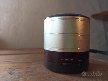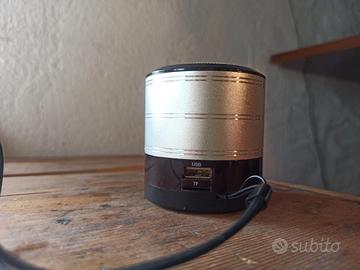 Vendo cassa portatile modello QC‑18. Funziona come radio FM e lettore MP3 tramite scheda microSD. Non ha il Bluetooth. Il suono è buono per le sue dimensioni. Includo il cavetto USB per la ricarica.