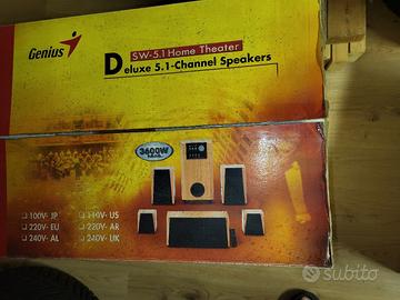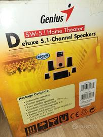 set home theater 5.1 genius casse in legno di buona quaalita' ; subwoofer amlificato e dotato di contolli di tono separati , volume e igressi separati. come al nuovo.
