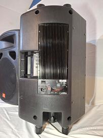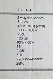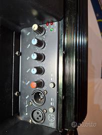 Casse acustiche Bi-amplificate 400w RMS , 300w LF , 100w HF , utilizzabili anche come monitor da palco o sospeso. Maniglia , flangia per stativo e 4 punti M10 per la sospensione a soffitto. Ingressi xlr con regolazione di guadagno ed equalizzatore a 3 bande.