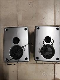 Casse Acustiche Majestic Blu e Argento, con spinotti come in foto non so per cosa, 24x14x19 P. Credo 5/10 W non so quanti ohm.