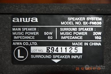 Vendo casse AIWA 50W di potenza ottime condizioni,con effetto surround,IN REGALO console AIWA NSX-D636 solo parte ampli e radio (lettore cd e cassette non funzionante)ottima per ascoltare la radio ( display radio non illuminato) o per effetto teatre guardando la TV.
