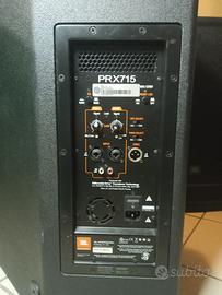 Coppia di casse attive jbl prx 715 Woofer 15", 1500w, potenti e ottimo suono. Cabinet in legno ma peso contenuto 21kg Utilizzate poco in quanto seconda coppia di rinforzo, ottime condizioni.