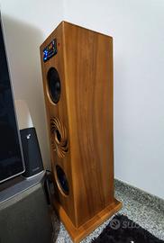 Casse audio Bluetooth 5.3 a torre, alte 84cm, costruzione artigianale in vero legno massello di frassino! Ideali per tv, smartphone, tablet, pc etc...Ti basta solo inserire il cavo di alimentazione! Dotate di telecomando e cavo per l'alimentazione. L'elettronica è un dispositivo Bluetooth da 200watt, ha anche la radio fm, lettura da memorie tf, sd e USB, entrata microfono per karaoke 🎤, supporta la registrazione , supporta le chiamate, line in e aux mode. Ha varie impostazioni di equalizzazione preimpostati, ma si possono regolare a piacimento bassi, alti e altro. Il volume può essere regolato da telecomando o direttamente dal dispositivo agendo sulla manopola. I 2 altoparlanti a vista sono dei pioneer da 16cm realizzati in cassa chiusa, il sub invece è da 21cm ed è dotato di bass reflex (sul retro). La torre è divisa all'interno in 5 camere, rivestite insieme ai cavi e al pannello posteriore per eliminare qualsiasi vibrazione e migliorare il suono. Il design è stato un dibattito, ho scelto la torre perché occupa meno spazio, è abbastanza imponente, e i bordi arrotondati addolciscono la sua prepotenza. La realizzazione della struttura è stata studiata e realizzata in legno di frassino, con incastri fissi, e dove previsto smontabili. Colore noce chiaro, verniciatura a spruzzo a poro aperto, legno, duro e stabile nel tempo. La finitura è un trasparente opaco. Sotto abbiamo la base che comprende 4 massicci piedini in gomma e un foro quadrato che ospita una ventola silenziosissima che raffredda l'alimentatore. Il vero protagonista però è la griglia del sub traforata a mano, che richiama eleganza e unicità... Ho voluto poi valorizzare ulteriormente il centro con un cerchietto di alluminio rosso incastonato nel legno per richiamare il tasto di accensione rosso vicino al dispositivo Bluetooth. Sono delle casse uniche, realizzate a mano, che suonano egregiamente, qualità e potenza uniti all'eleganza di un oggetto in legno, che aggiungono arredamento all'ambiente