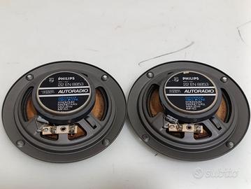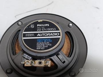 Altoparlanti per autoradio della Philips modello 22 EN 8853 vintage, cono impermeabile, triplo cono, magnete di stronzio 4.4 Oz, potenza massima 25 W, impedenza 4 OHm, hi power hi-quality autoradio, speakers macchina, altoparlanti d'epoca, condizioni come da foto ed una ha la parte della griglia piegata