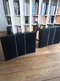 Casse passive Beovox RL 6000 gran bel suono molto pulito. Possono essere appoggiate al pavimento esaltando i bassi oppure appese ai supporti inclusi nell'annuncio. Come si vede dalle foto una cassa ha un lieve difetto agli angoli in alto della tela.