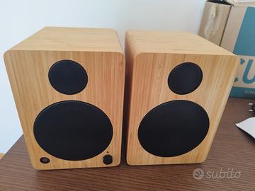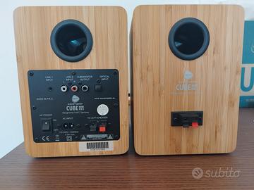 Vendo sistema di casse attive Wavemaster Cube Mini Neo 2.0 in vero bamboo, in condizioni pari al nuovo. Le casse sono state utilizzate pochissimo e sono perfettamente funzionanti. Bluetooth, Ingresso Ottico (Toslink), RCA e Jack 3.5mm. Uscita dedicata per eventuale subwoofer esterno. Standby automatico intelligente che rileva il segnale audio. Performance sonore: •Bassi definiti: Grazie al condotto bass-reflex posteriore e al woofer in cellulosa, i bassi sono presenti e corposi, ma mai fangosi o eccessivi. •Medi caldi e naturali: Il cabinet in vero bamboo non è solo estetico, il legno riduce le risonanze rispetto alla plastica, rendendo le voci estremamente chiare e calde, perfette per podcast, film e musica. •Alti cristallini: Il tweeter a cupola in seta garantisce dettagli elevati senza mai risultare stancante o troppo "tagliente" anche dopo ore di ascolto. •Personalizzazione: Tramite il telecomando è possibile regolare separatamente Bassi e Alti per adattare il suono ai propri gusti o all'ambiente. Incluso: •Coppia di casse Wavemaster Cube Mini Neo (Bamboo) •Telecomando originale •Cavi di collegamento originali •Manuale d'istruzioni •Scatola originale integra