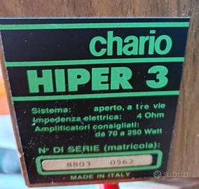 Coppia casse Chario 3 vie. Usato ottimo stato. Perfettamente funzionanti Lieve ammaccatura spigolo posteriore.