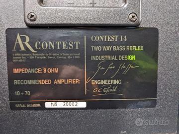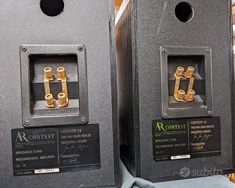 Casse Diffusori Acustici Speakers AR Contest 14, diffusori da scaffale Acoustic Research configurazione Bass Reflex Bi-Wiring, ribordatura recente, mobili molto massicci in buone condizioni, così come le teline, per amplificatori fino a 70 Watt su 8 Ohm, in vendita a 200 Euro, sono spedibili, contatto solo telefonico al 3356165594, ribordatura altoparlanti e woofer, riparazione teline, realizzazione coperchio giradischi su misura, restauro Technics SL 1200 e 1210, visibile ed ascoltabile a Busto Arsizio.