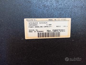 vendo casse diffusori Sony ss-a705 (hi-fi) tenuti perfettamente, paragonabili al nuovo. ottima acustica, perfettamente funzionanti. le caratteristiche le trovate in foto. difficili da trovare in queste condizioni. consegna a mano così ne verificare le condizioni.