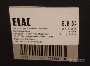 Vendo coppia di casse Elac ELR 54 come nuove e perfettamente funzionanti, sistema a 3 vie da 75 watt con un suono caldo e dettagliato, suonano benissimo con qualsiasi genere musicale, vecchia scuola made in Germany ! Controllate e pulite prima della vendita, solo cose belle (vedi le mie offerte). Posso spedire con imballo accurato o meglio il ritiro a mano (non rispondo da danni causati da corrieri) no offerte ridicole ne resi ne perditempo.