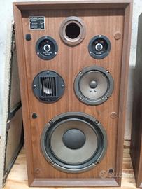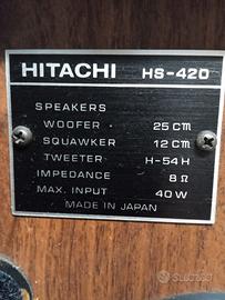 Coppia casse Hitachi mod. HS-420, vintage di classe alta, perfettamente funzionanti, provenienti da rientro in permuta con altro materiale hi-fi, estetica 99%, tele protettive integre (una con un alone dovuto a pulizia non corretta..), con interventi su tweeter e medio per ogni cassa (visibili nelle foto che sono proprio delle casse in vendita), svendo per smaltimento collezione.