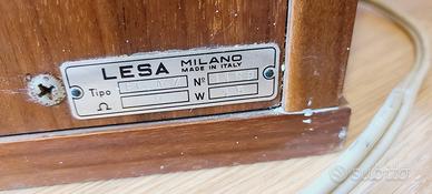 LESA ECA7 del 1966, woofer 265mm + tweeter 130mm. Potenza maxi 15 W. Risposta da 35 a 15 000 c/s. Struttura in legno. Dimensioni H 350 L 570 P 212 mm. Peso 8,2 kg.