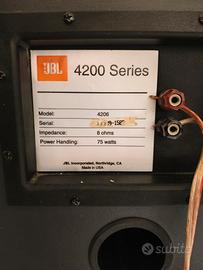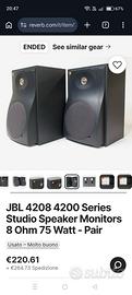 Come da titolo vendo bellissime casse della JBL 4208 4200 Series Studio Speaker Monitors 8 Ohm 75 Watt - Pair in più un subwoofer della ALL TEL. Le casse sono passive. Non spedisco preferisco consegna a mano, prezzo leggermente trattabile.