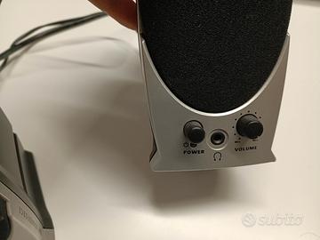 coppia di casse acustiche per PC design moderno con finitura argentate controlli di volume e accensione sul fronte ingrasso per cuffie
