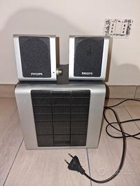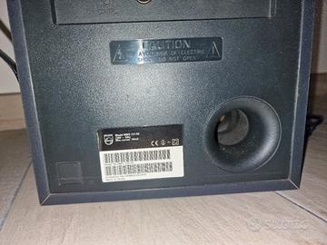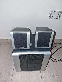 Vendo sistema di casse acustiche 2.1 Philips modello MMS 231/00, perfettamente funzionante. Il set è composto da un subwoofer centrale e due satelliti compatti dal design elegante argento/nero. Qualità Audio: Suono nitido con bassi regolabili grazie al potenziometro dedicato sul retro del subwoofer. Connessioni: Ingresso standard jack 3.5mm (compatibile con PC, laptop, smartphone, tablet e TV). Condizioni: Esteticamente ben tenuto (come da foto) e testato. Incluso: Subwoofer, 2 satelliti, cavi di collegamento e alimentazione integrati. Pronto all'uso, ideale per smart working, gaming leggero o per ascoltare musica in ufficio/camera.