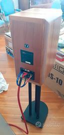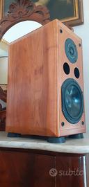 Diffusori da supporto in ottime condizioni, progettate dall'Ing. Giuseppe Prato su richiesta di un noto Negozio di HI-FI di Roma. Il cabinet è opera di alta ebanisteria realizzata in noce nazionale massello a doghe di circa tre centimetri di spessore con doppio condotto reflex anteriore. Potenza 120 W RMS /175 W MAX - Impedenza 8 ohm; Woofer Vifa da 17,5 cm; Tweeter Vifa DT 26.8/1 a cupola morbida raffreddato in ferrofluido (tweeter analogo è stato impiegato su diffusori quali Dahlquist 12, Snell E-III e A2); Cablaggio interno Monster Cable. Dato il peso e la delicatezza del prodotto è consigliato il ritiro a mano