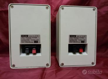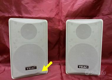 Coppia di casse TEAC LS X5, usate ma ben conservate, per specifiche vedi targhetta in foto 2. Si segnala lieve ammaccatura sul frontale di una cassa (foto 3 freccia gialla)