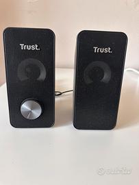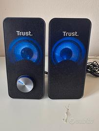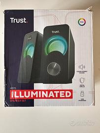Casse per pc. Alimentazione con presa usb. Collegamento aux 3,5mm per la sorgente audio. Illuminazione che cambia colore quando sono accese. Come nuove, con imballaggi originali