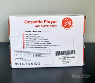 Riscopri il fascino del vintage con questo pratico Cassette Player con radio AM/FM, ideale per ascoltare le tue cassette preferite e sintonizzarti sulle stazioni radio in modo semplice e immediato. Compatto, leggero e facile da usare, è perfetto per chi ama i dispositivi retrò ma funzionali, sia per uso personale che come idea regalo originale. Dotato di altoparlante integrato, ingresso per cuffie da 3,5 mm e funzione di registrazione da radio AM/FM o voce esterna su cassetta, offre un’esperienza completa e versatile. Può essere alimentato con 2 pile AA oppure tramite DC 5V, rendendolo comodo anche in mobilità.