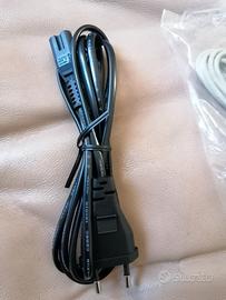 Disponibili due cavi: uno per l'alimentazione e uno audio. Il cavo di alimentazione è nero e presenta una spina europea. Il cavo audio è grigio chiaro e ha due connettori jack da 3.5mm. Entrambi i cavi sono nuovi di pacca.