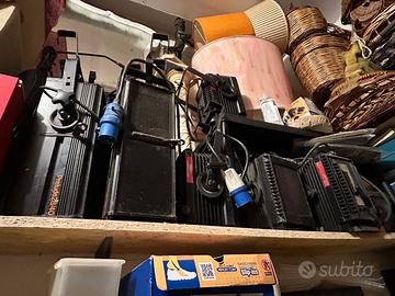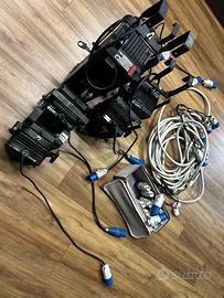 Cavi cablati di varie lunghezze. Anche 2 cavi prolunga da circa 15 mt con 5 prese CEE da 32 per ogni cavo. Varie spine sfuse e trasformatori come in foto. Fari alogeni