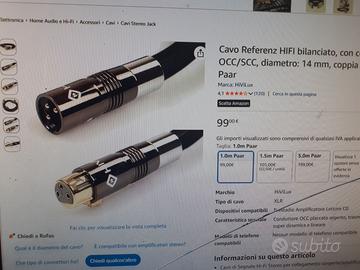 coppia di cavi XLR HiViLux Referenz HIFI da 1 metro, condizioni pari al nuovo. Modello con conduttori OCC 99,9997%, doppia schermatura, connettori full‑metal placcati oro 24K e ferriti anti‑disturbo. Caratteristiche: • Cavo bilanciato XLR/NF OCC/SCC • Conduttori OCC 6N + rivestimento in argento • Doppia schermatura (rete + foglio) • Connettori professionali a serrare • Diametro 14 mm, costruzione molto solida • Ideali per DAC, pre, finali, amplificatori bilanciati